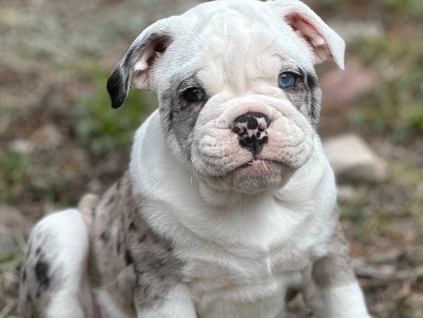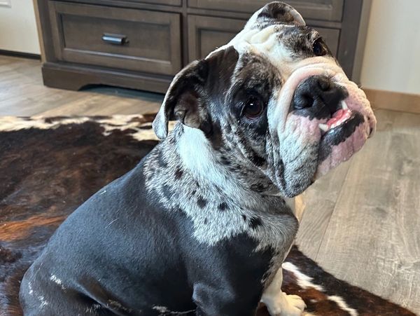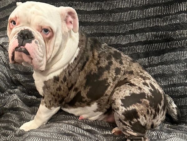 Oreo is our 2-year-old AKC Merle English Bulldog. Her mother, Becca, and her father, hail from a reputable breeder in Missouri. Her father is a stunning Merle with beautiful blue eyes, and Becca is a Blue Seal Piebald. Both Father and his sire are award-winning show dogs. Oreo, with her sweet and mellow nature, is deeply attached to her dad and is often found wherever he is at home. She will be ready to breed after her second birthday in August 2024.
